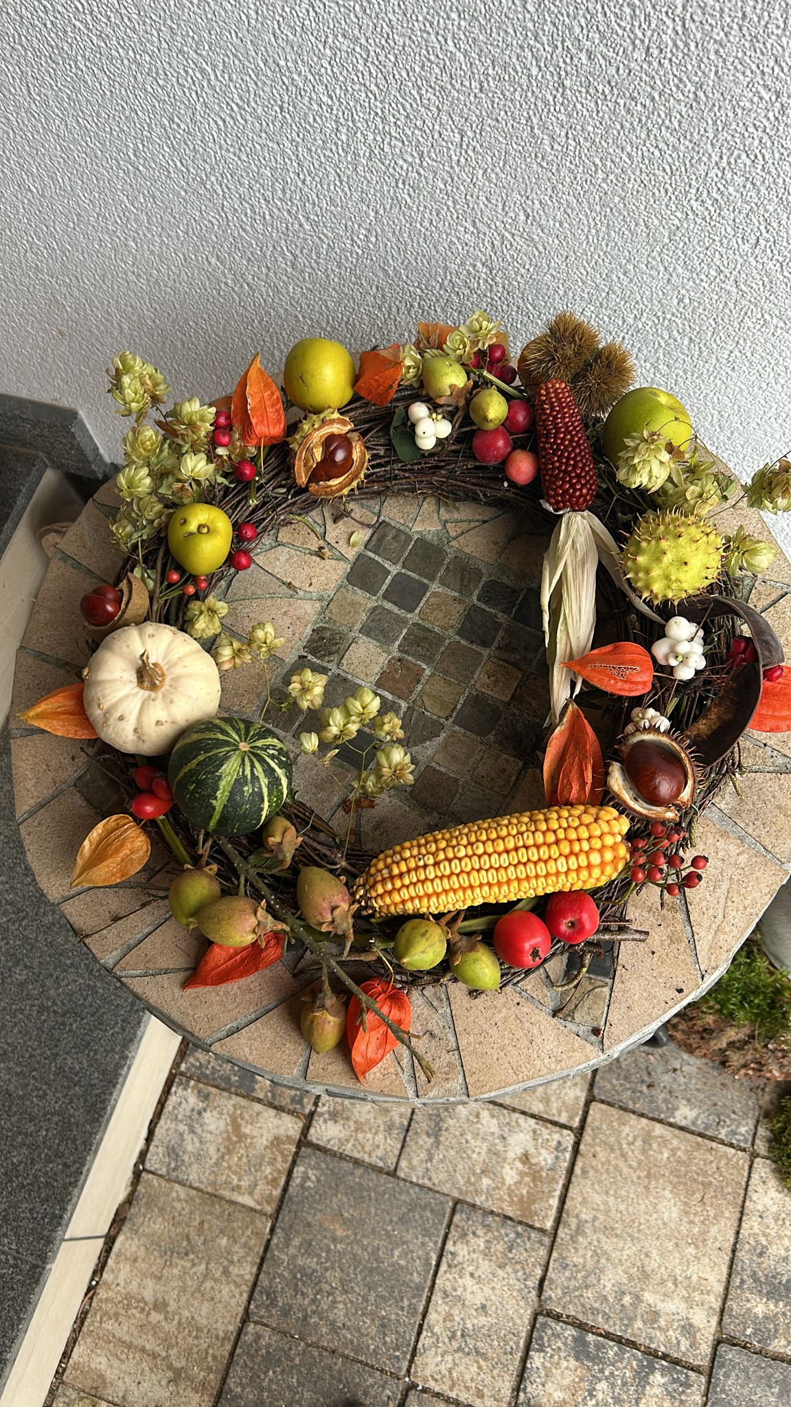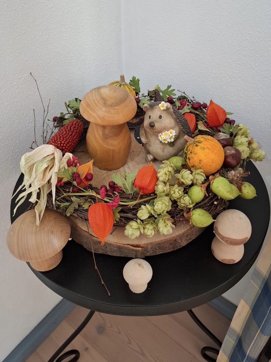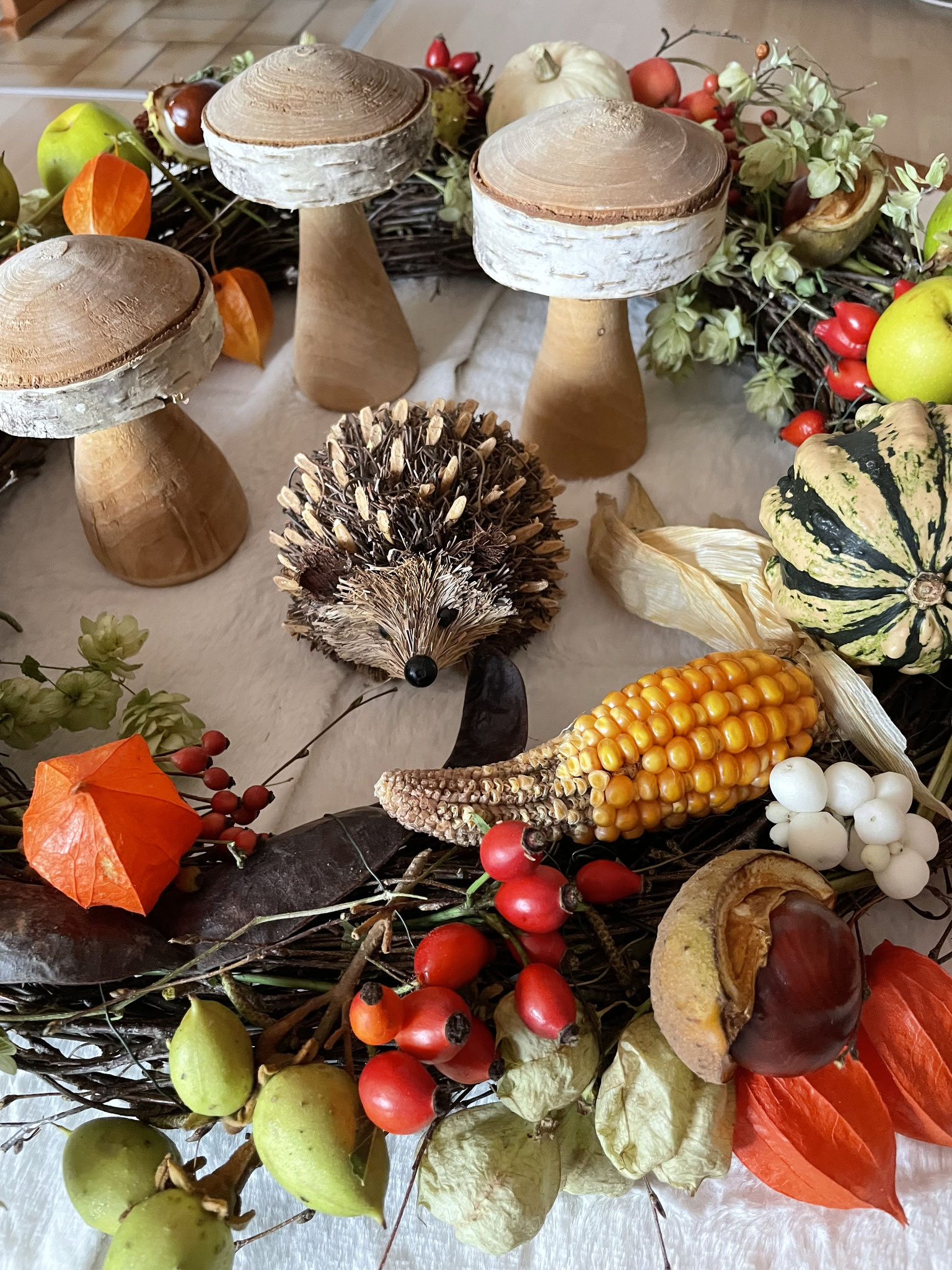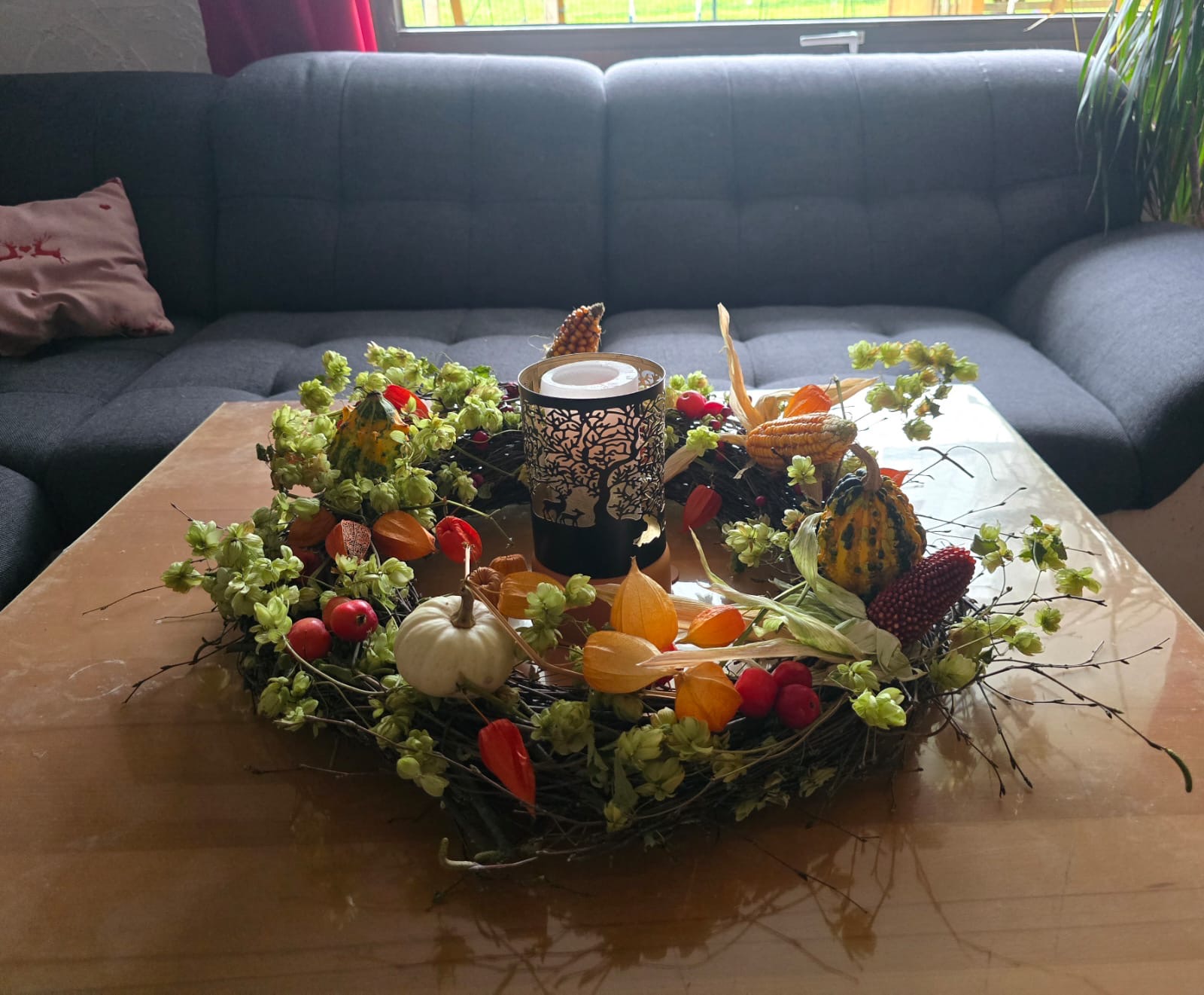 Zu Beginn wurden die Materialien vorbereitet – Birkenzweige, Hagebutten, Zieräpfel, Maiskolben, Hopfen, Zierkürbisse, Kastanien und vieles mehr. Anders als bei herkömmlichen Kränzen wurde diesmal nicht auf einen Rohling gebunden, sondern das Naturmaterial direkt in der Schüssel arrangiert und verarbeitet.