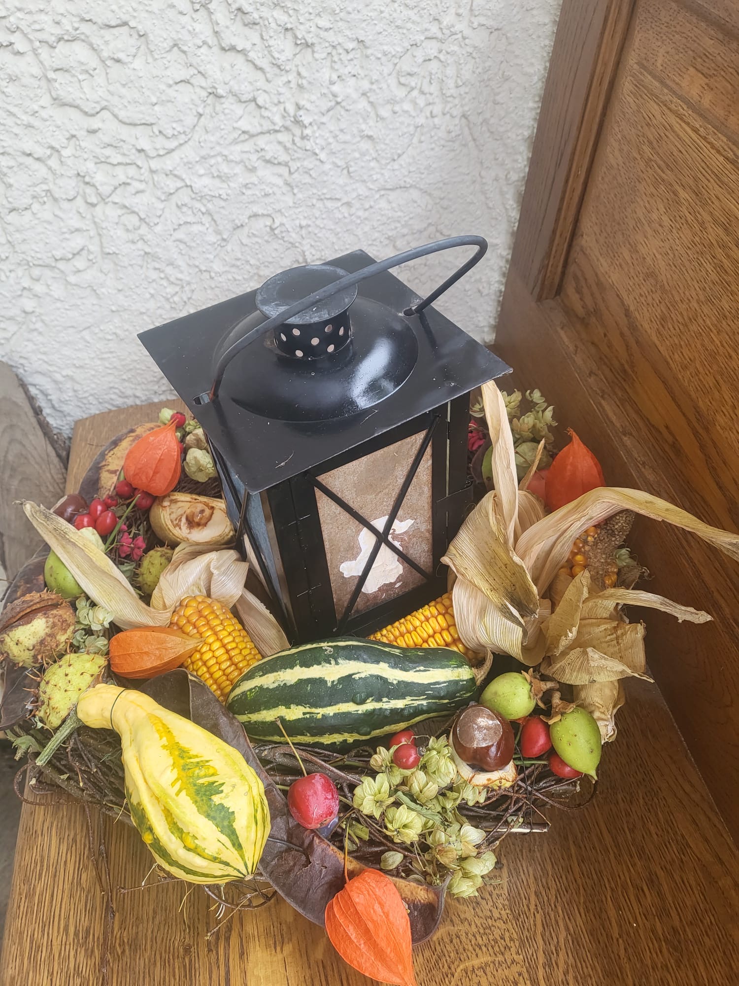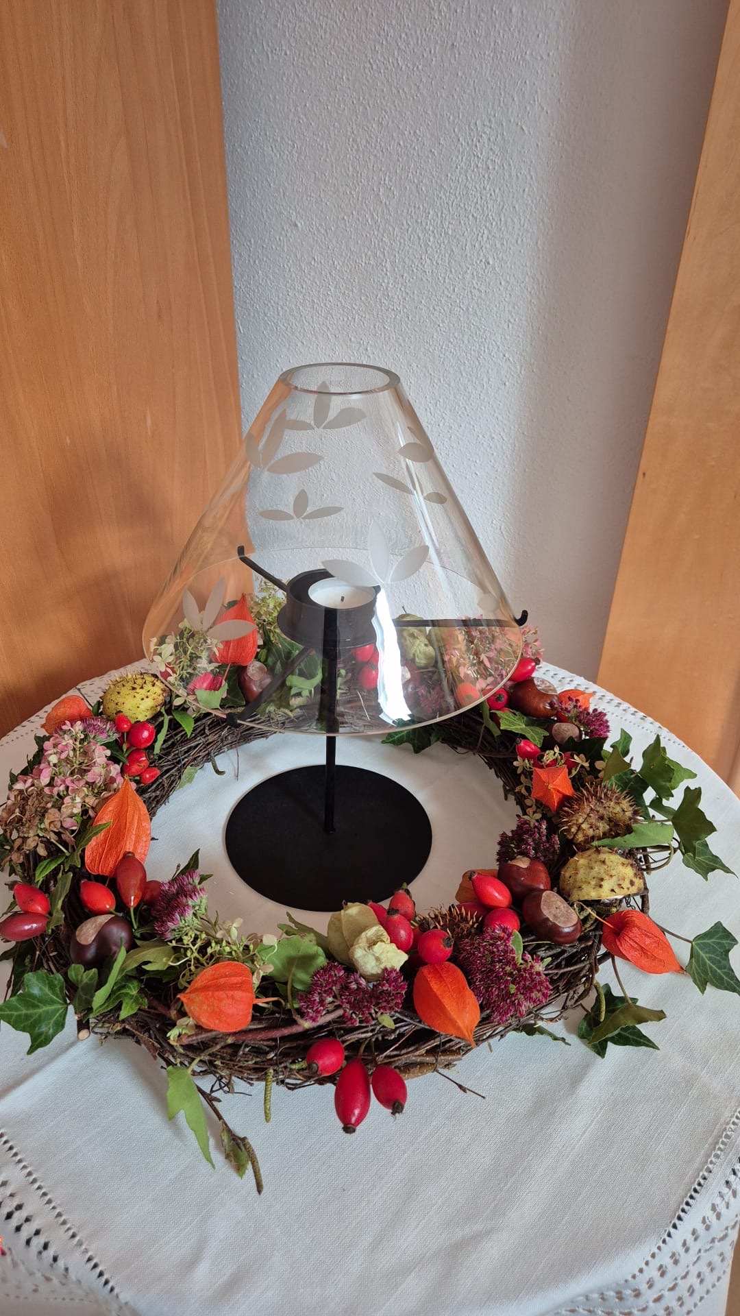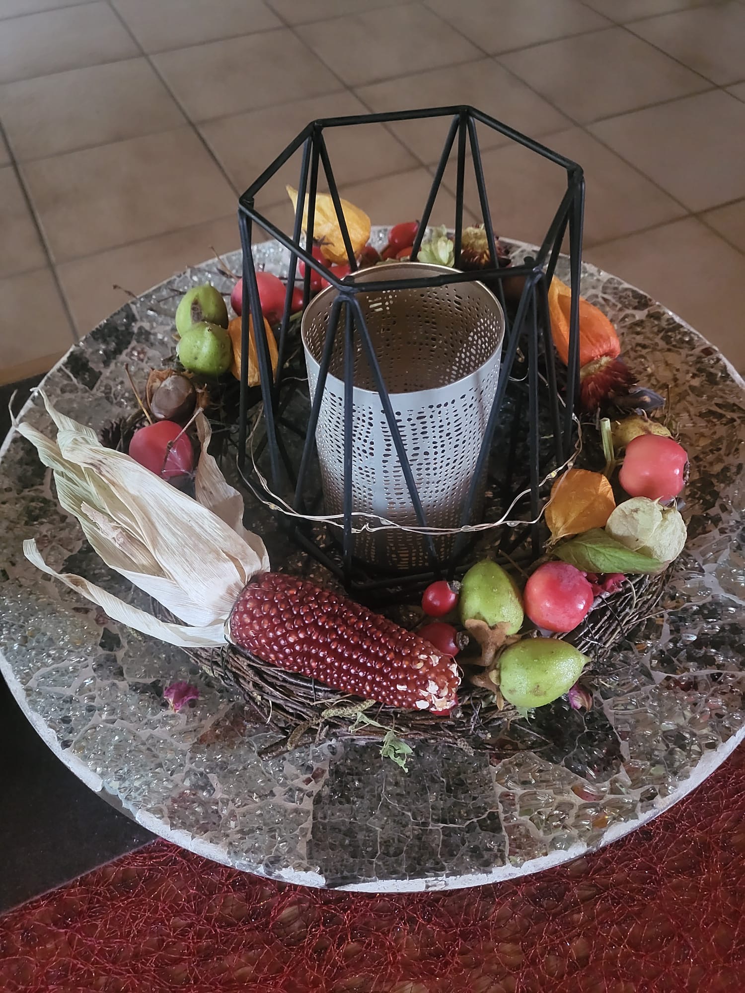 Zu Beginn wurden die Materialien vorbereitet – Birkenzweige, Hagebutten, Zieräpfel, Maiskolben, Hopfen, Zierkürbisse, Kastanien und vieles mehr. Anders als bei herkömmlichen Kränzen wurde diesmal nicht auf einen Rohling gebunden, sondern das Naturmaterial direkt in der Schüssel arrangiert und verarbeitet.